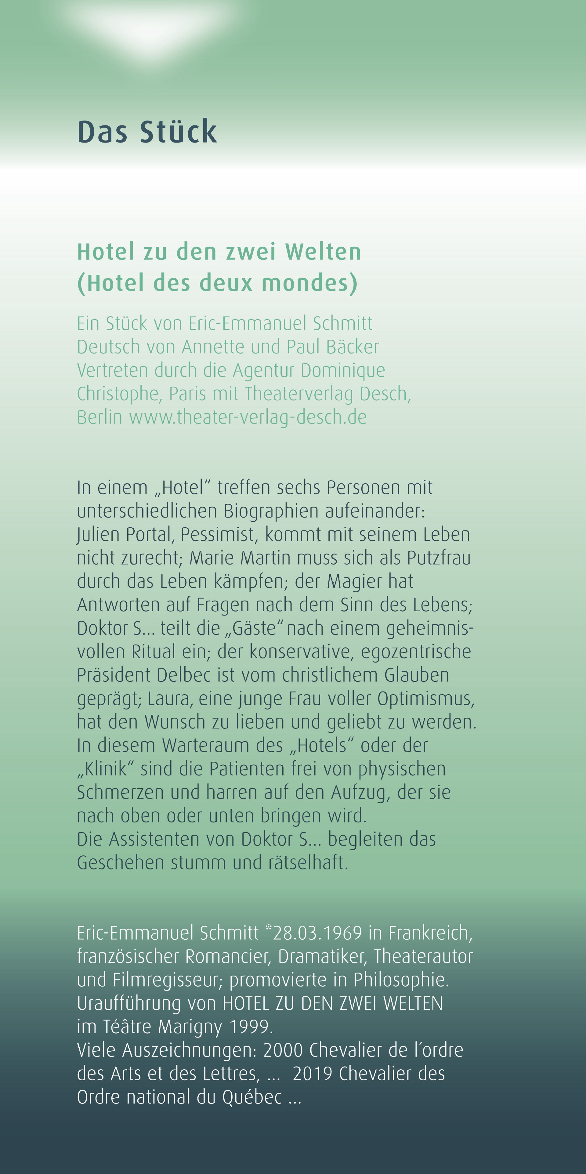 Dieses Theaterstück von dem bekannten Dramatiker und Theaterautor Eric-Emmanuel Schmitt beschreibt das Zusammentreffen von sechs sehr unterschiedlichen Personen in einem fiktiven Raum. Befinden sie sich wirklich in einem Hotel? Warum sind sie überhaupt hier? Wer hat hier das Sagen? Die verschiedenen Biografien und Charaktere sorgen für eine spannende Auseinandersetzung mit den Fragen des Lebens.